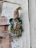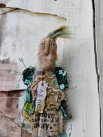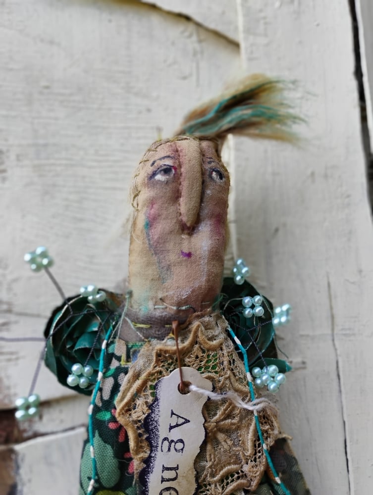 Agnes Pearl is made of muslin and calico fabric with a tulle underskirt. She has llama roving for hair.