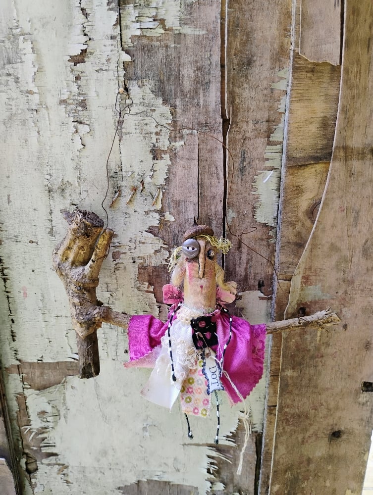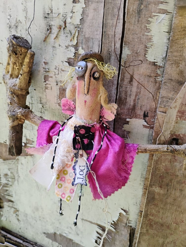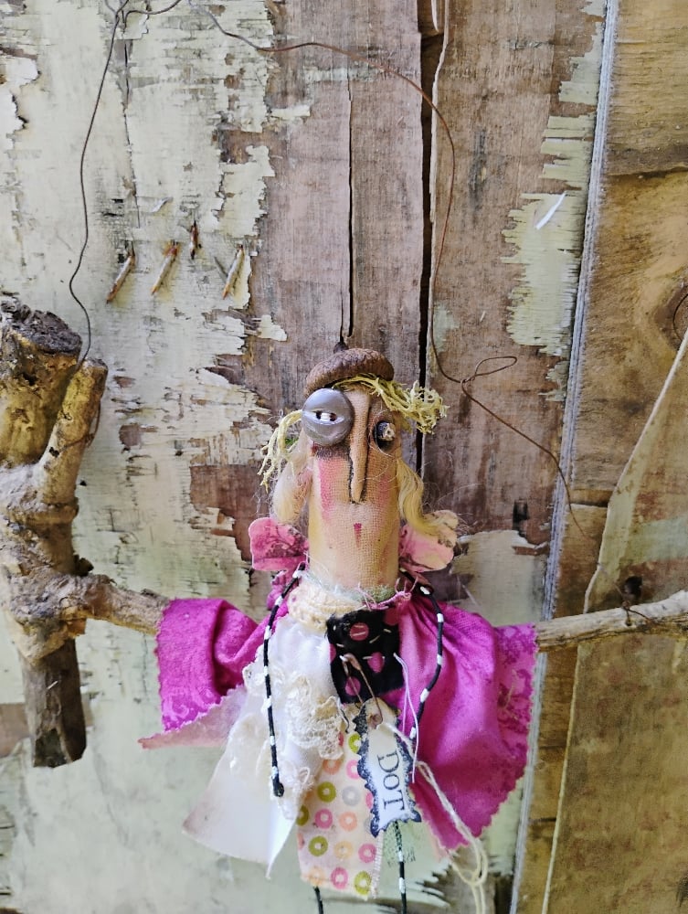Her sheep roving hair is sewn on and she has adorned it with a bit of Reindeer moss.
