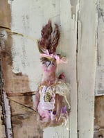 Her body is made of muslin. She has a dress sewn to her body, with various pieces of vintage lace and coffee dyed fur added by hand. Her face is painted with acrylics.