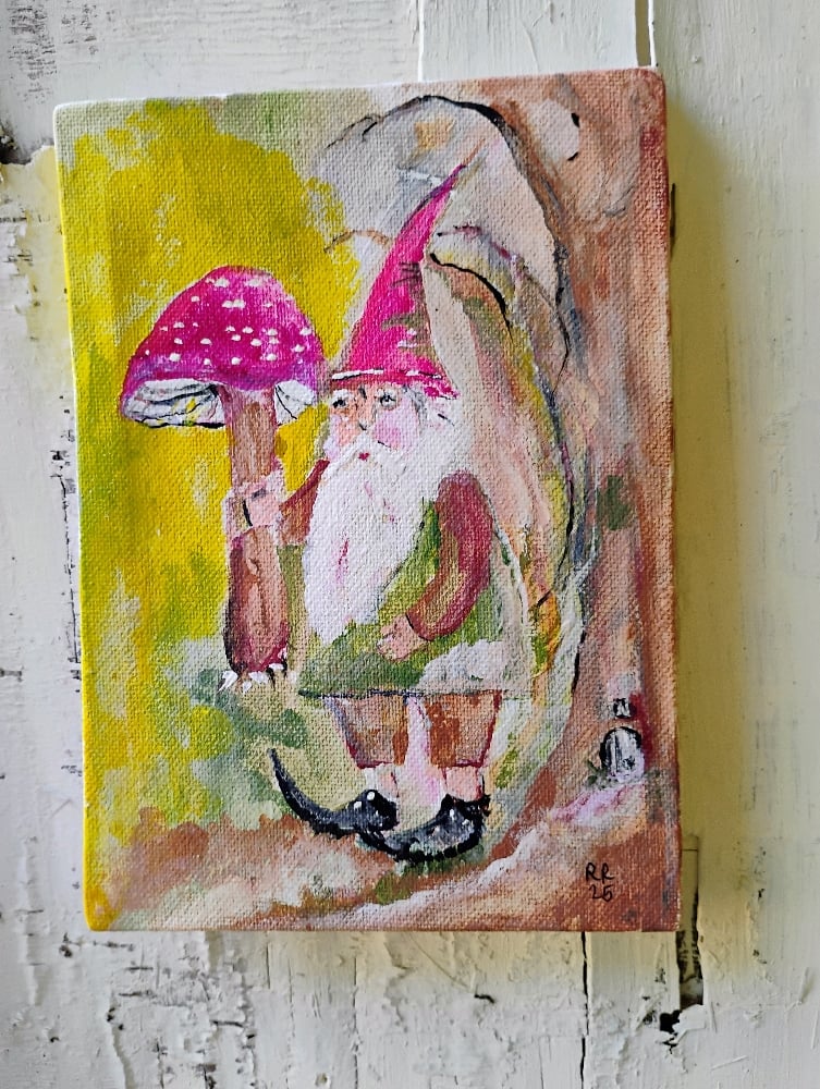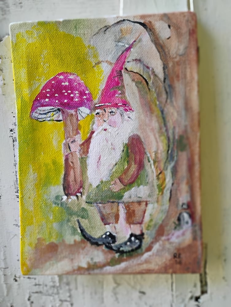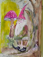 It depicts a Gnome using an amanita toadstool to illuminate his way to the Cocoacup Cotillion.